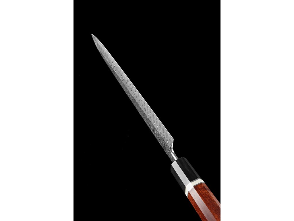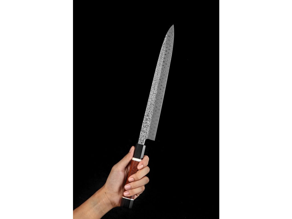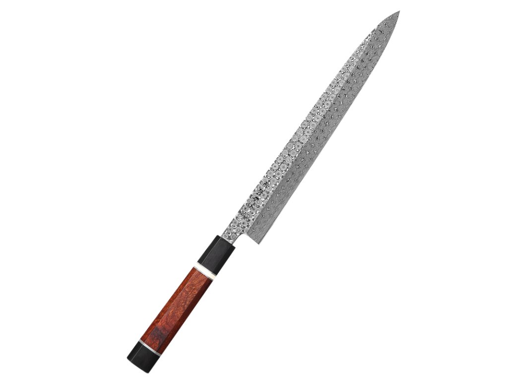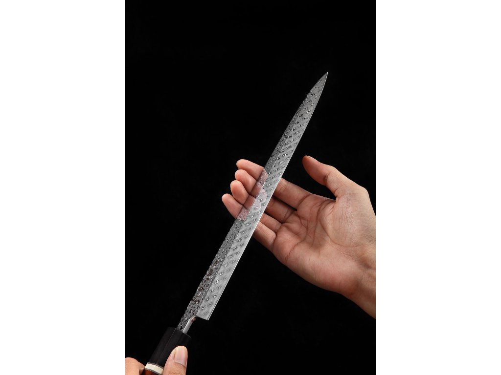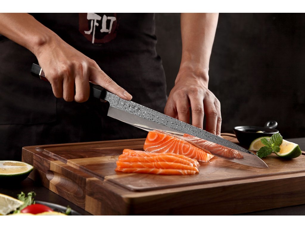Spezielles Sashimi Messer im japanischen Stil mit 270-mm-Klinge aus hochwertigem Damaststahl, ideal zum Schneiden perfekter Scheiben von Fischfleisch nicht nur für Sushi. Mit traditioneller japanischer achteckiger Griffform.