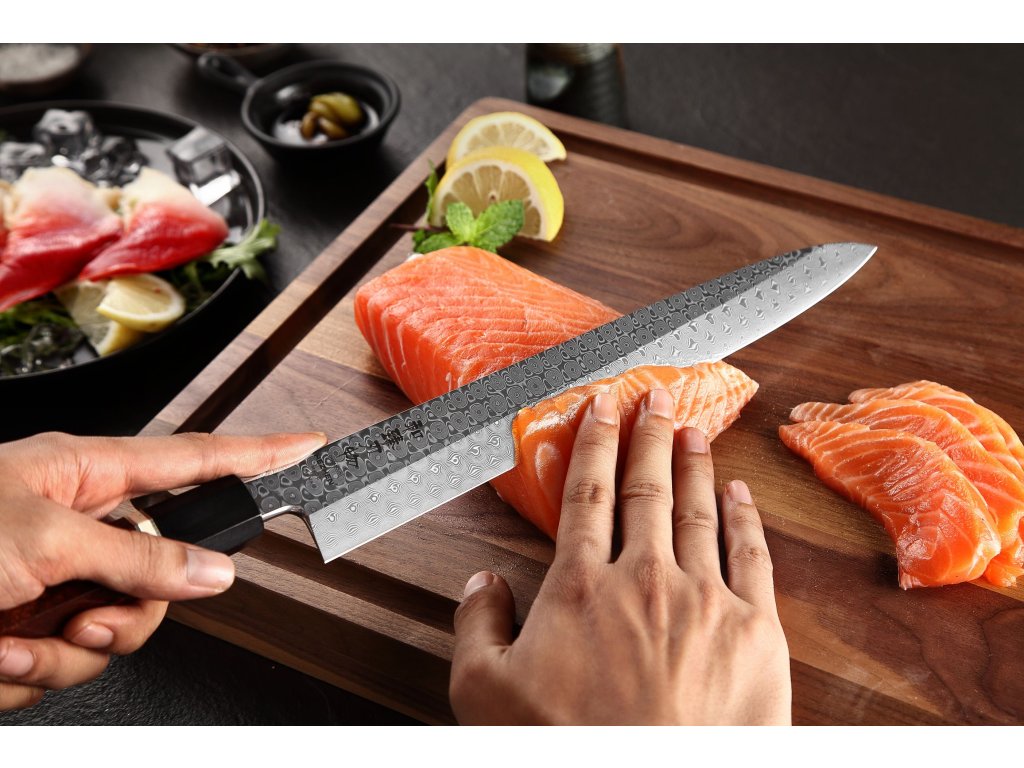 Dieses Sashimi Messer ist aus hochwertigem Damaszenerstahl gefertigt, der für die Herstellung der besten Messer verwendet wird. Die Klinge des Messers mit 60±1 Rockwell-Härte besteht aus 110 Lagen Damaststahl. Der hochwertige Stahl sowie eine Kombination aus traditionellen und modernen Fertigungstechniken sorgen für eine lange Lebensdauer des Messers. Seine Oberfläche bietet beim Schneiden Komfort, ohne dass es reibt oder dass die Zutaten an die Klinge pappen. Das Messer hat eine einseitige japanische Klinge. Der Farbton des Musters auf der Klinge kann unterschiedlich sein, da jedes Messer durch das Stahlschichten einzigartig ist.