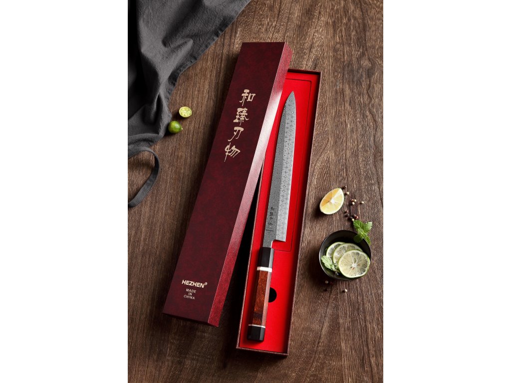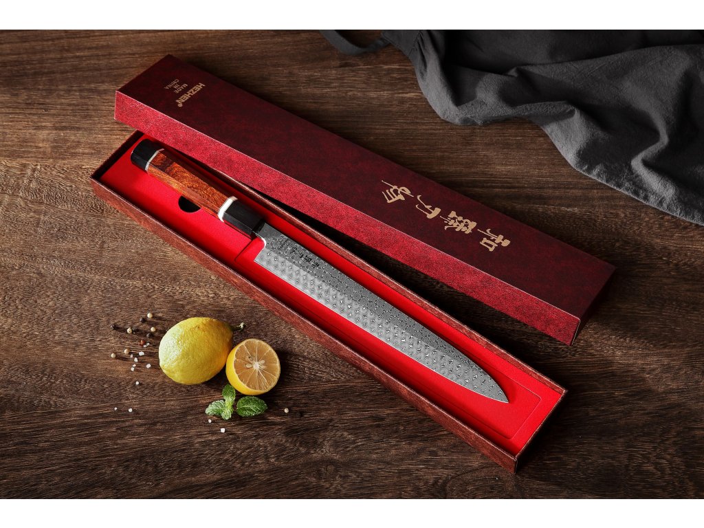 Das Sashimi Messer HEZHEN F3 mit 270 mm langer Klinge ist in einer luxuriösen Geschenkbox verpackt und eignet sich somit als ein ideales praktisches Geschenk. Das luxuriöse Design der Geschenkbox und das hochwertige XinZuo Messer im Set wird jeden Beschenkten Freude machen.