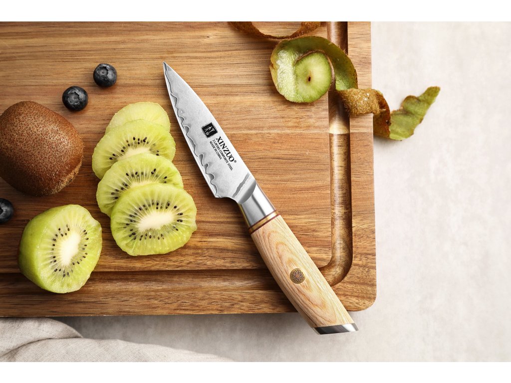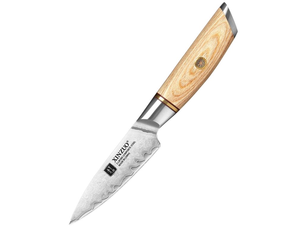 Hochwertiges Schälmesser XinZuo Lan B37S, 9 cm, ist ein Design-Stück, Klinge aus Verbundstahl und Griff aus Pakkaholz.