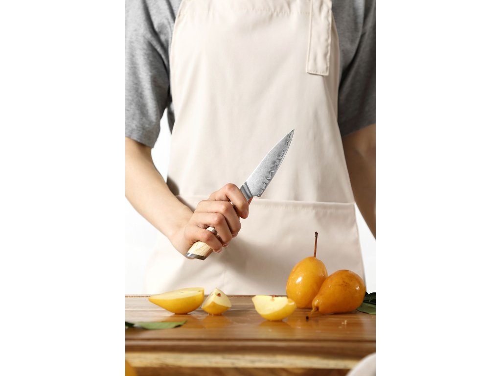 Dieses Schälmesser ist aus drei Lagen hochwertigem Verbundstahl gefertigt. Der Kern des Messers besteht aus 10Cr15CoMoV-Stahl und ist beidseitig durch rostfreien SUS410-Stahl gegen Korrosion geschützt. Das Messer hat eine Härte von 60±2 Rockwell. Hochwertiger Stahl in einer Kombination von traditioneller Herstellung garantiert eine lange Lebensdauer des Messers. Die Oberfläche des Messers bietet beim Schneiden Komfort, ohne dass es reibt oder dass die Zutaten an die Klinge pappen. Die Klinge ist von Messerschmieden nach japanischer Art in einem Winkel von 15° auf beiden Seiten handgeschliffen. Der Farbton des Musters auf der Klinge kann unterschiedlich sein, da jedes Messer durch das Stahlschichten einzigartig ist.