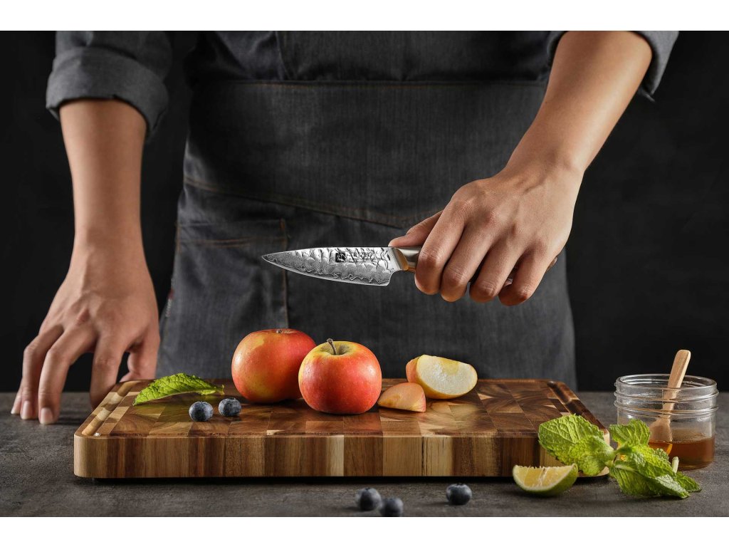 Schälmesser - Dieses spezielle Schälmesser mit kurzer, scharfer Klinge und leicht abgerundeter Schneide ist ein unverzichtbares Werkzeug für die primäre Zubereitung von Obst und Gemüse. Es übertrifft herkömmliche Kartoffelschäler und ermöglicht ein schnelles und präzises Schälen ohne unnötigen Verlust des Fruchtfleisches. Dank seiner Vielseitigkeit schafft es nicht nur Äpfel, Zitrusfrüchte oder Kartoffeln zu verarbeiten, sondern es eignet sich auch perfekt zur Zubereitung von Pilzen. Mit diesem Messer wird die Zubereitung von Zutaten effizienter und bequemer.