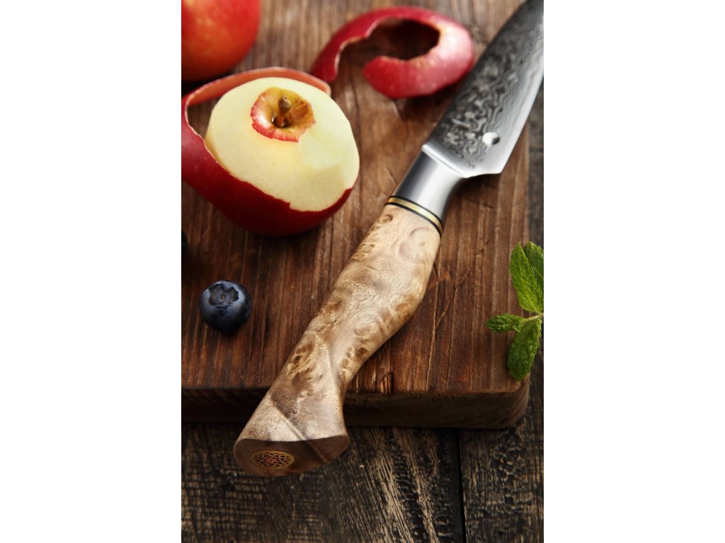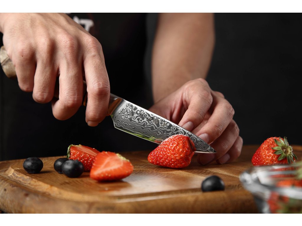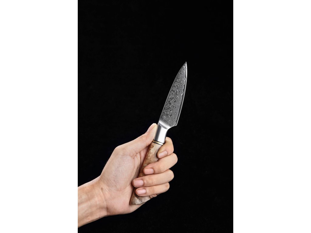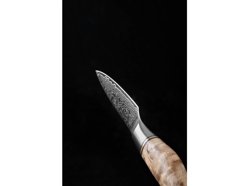 Dieses Schälmesser ist aus hochwertigem Damaszener Stahl gefertigt, der für die Herstellung der besten Messer verwendet wird. Die Messerklinge mit einer Härte von 60±2 Rockwell besteht aus 67 Lagen. Hochwertiger Stahl in einer Kombination von traditioneller Herstellung garantiert eine lange Lebensdauer des Messers. Seine Oberfläche bietet Komfort beim Schneiden, ohne dass es reibt oder dass die Zutaten an die Klinge pappen. Der Farbton des Musters auf der Klinge kann unterschiedlich sein, da jedes Messer durch das Stahlschichten einzigartig ist.