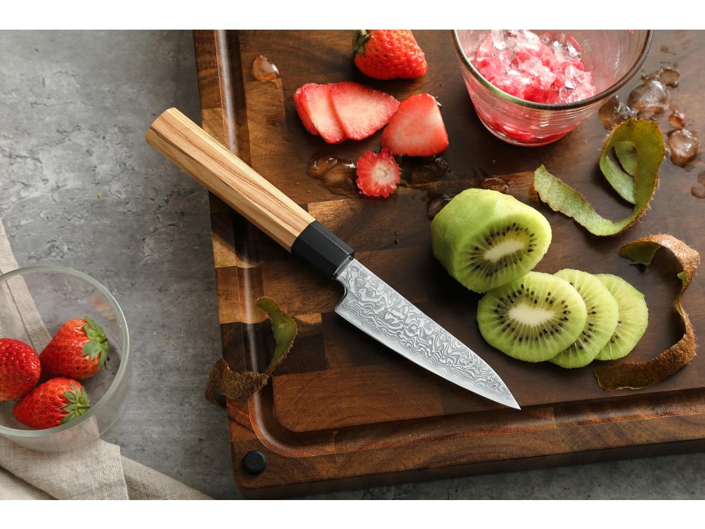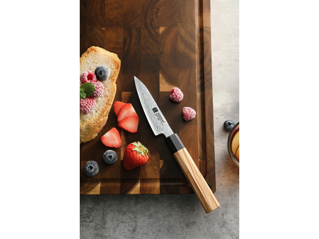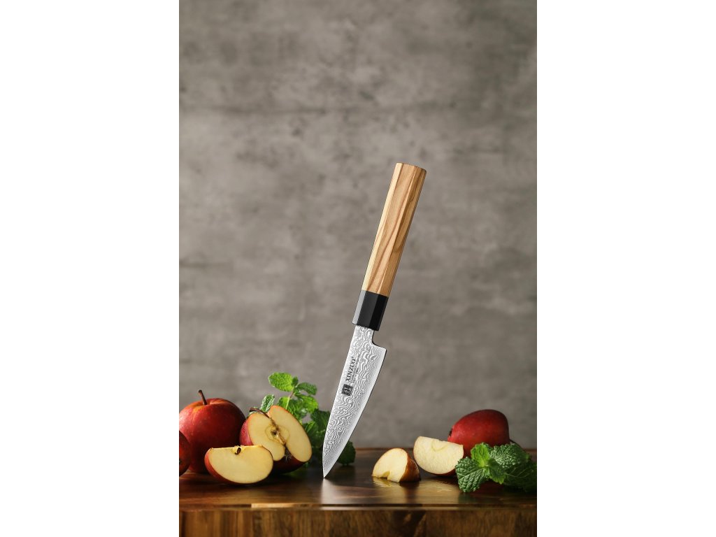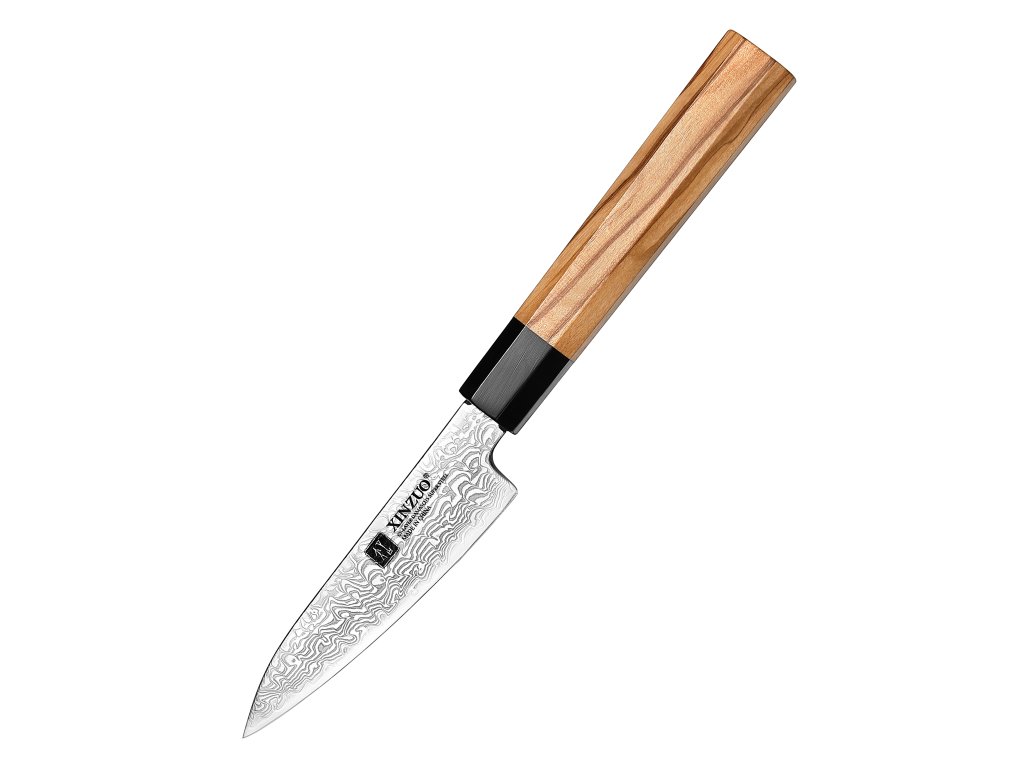 Elegantes Schälmesser XinZuo Zhen PM8O 11 cm mit Klinge aus Damaszener Stahl und achteckigem Griff aus Olivenholz und Büffelhorn im japanischen Stil.