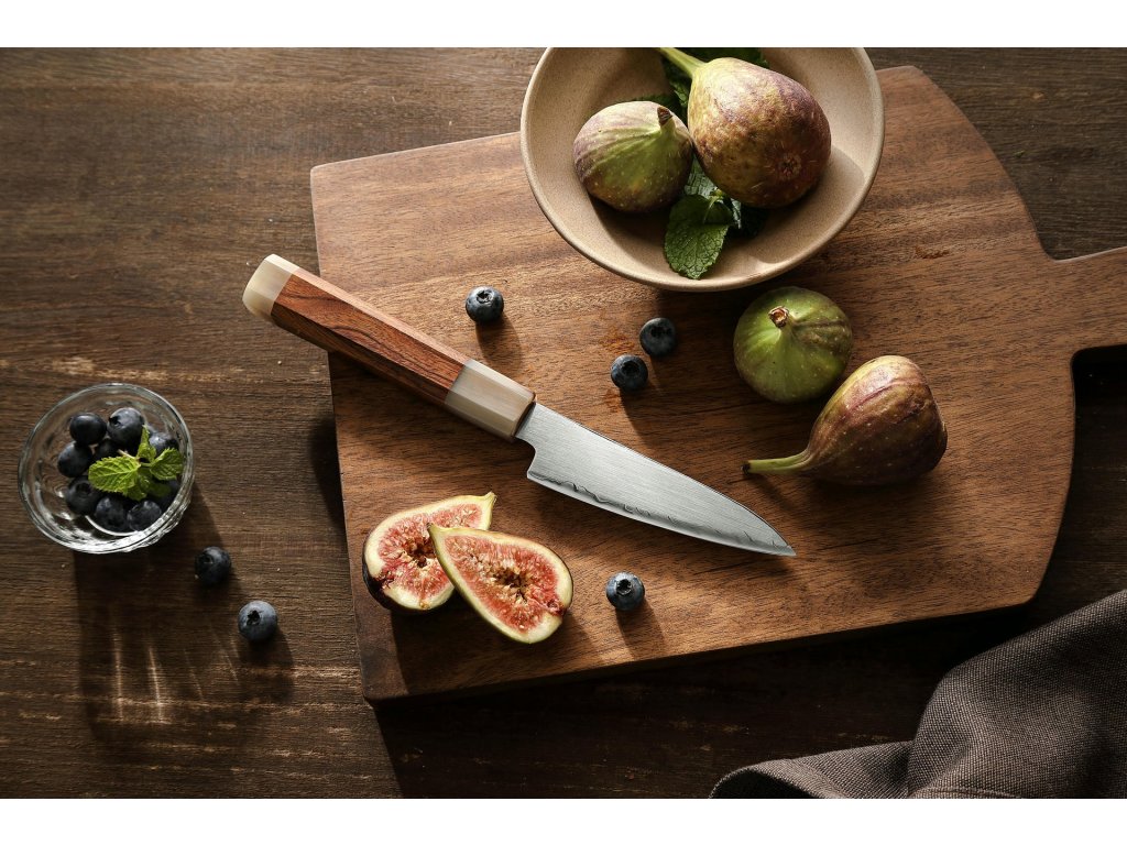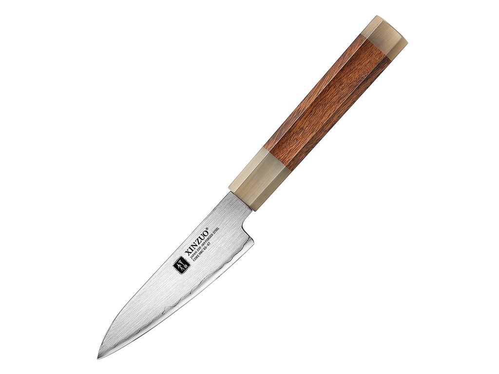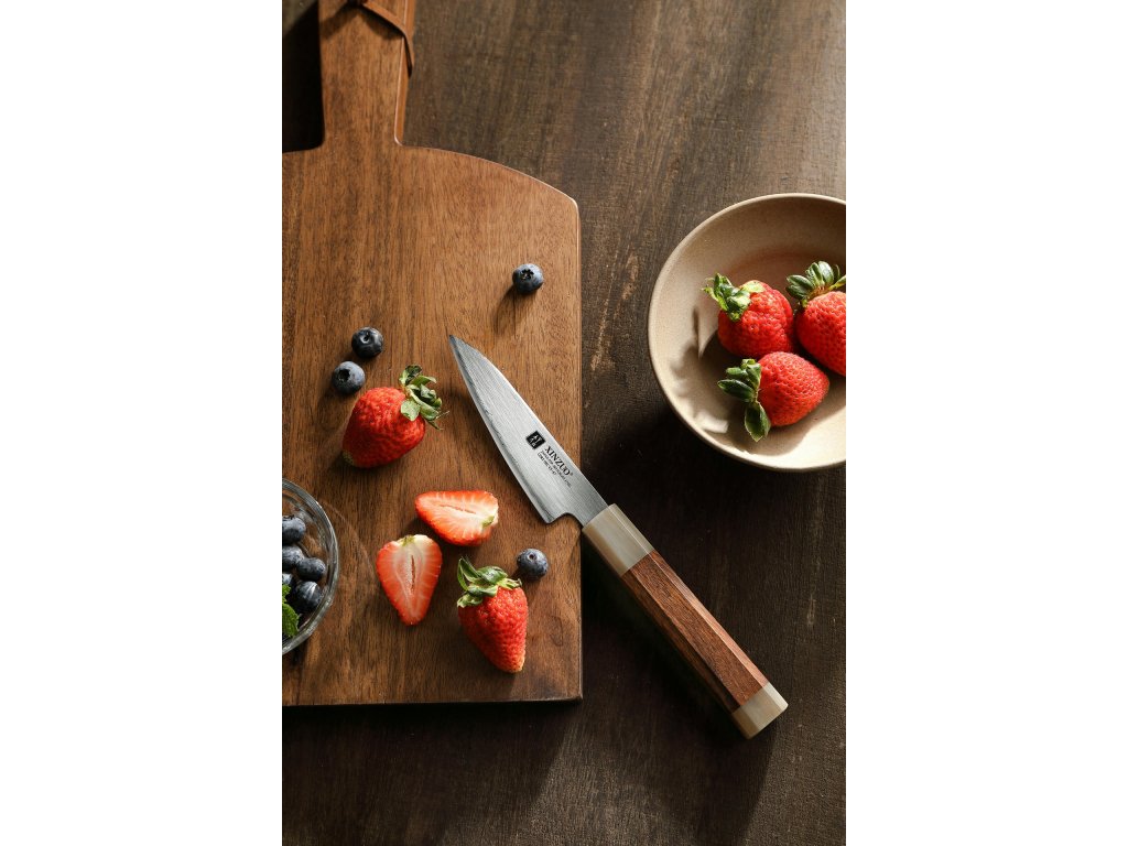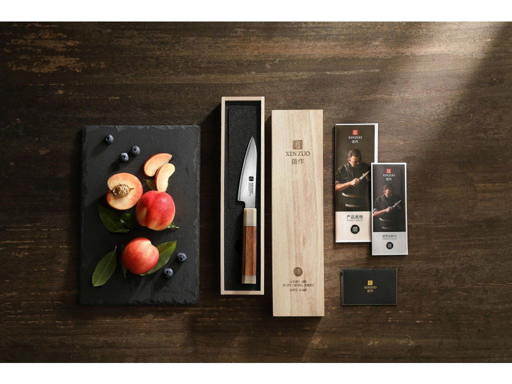 Das luxuriose Schälmesser XinZuo Zhen X05Z 11 cm mit einer Klinge aus japanischem Stahl und einem traditionellen achteckigen Griff, wird in einer eleganten Holzbox geliefert.