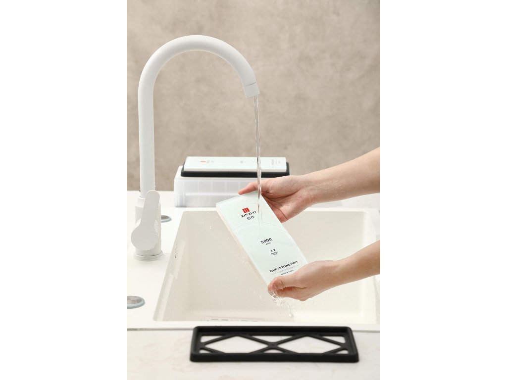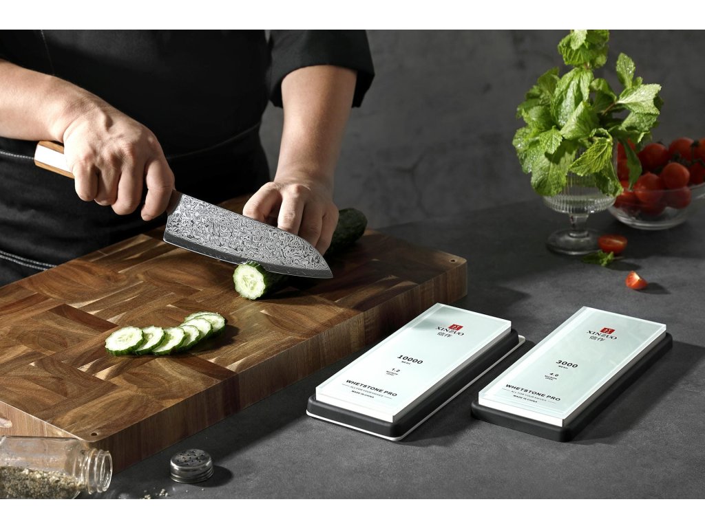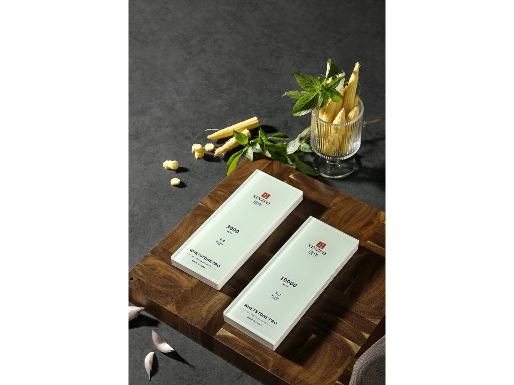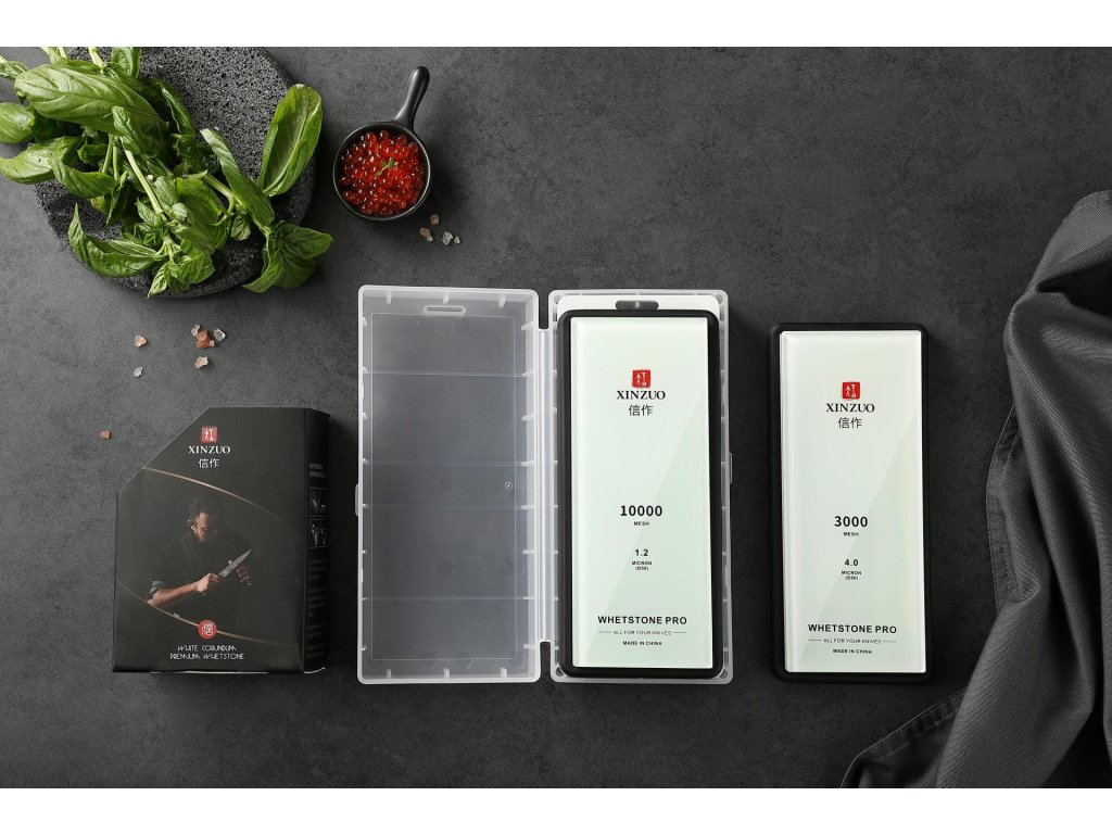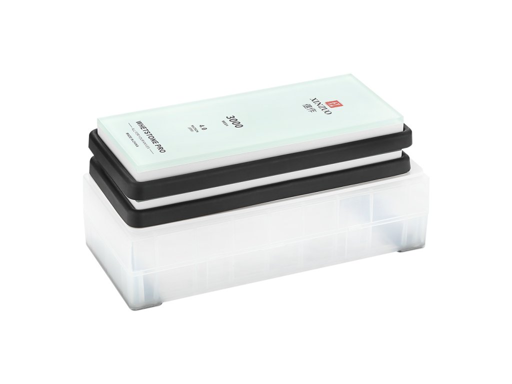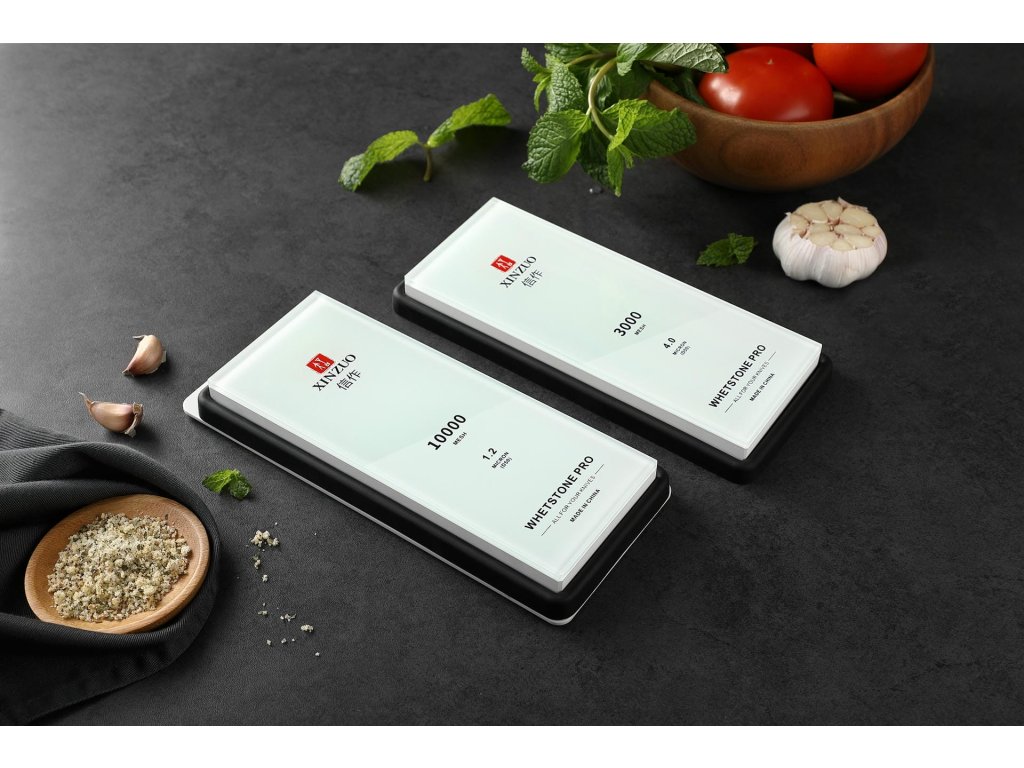 Ein Set aus zwei Schleifsteinen mit den 3000er und 10000er Körnungen dient zum Schleifen von Küchenmessern XinZuo und Hezhen. Es hat ein modernes und praktisches Design, ergänzt durch einen eleganten Sockel aus Temperglas und eine rutschfeste Silikonunterlage. Das Set wird außerdem mit einer praktischen Kunststoffbox geliefert, die eine einfache Aufbewahrung und ein bequemes Schleifen ermöglicht.