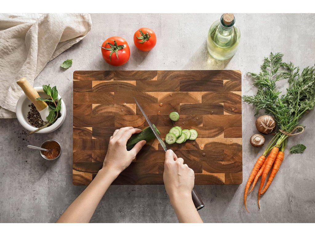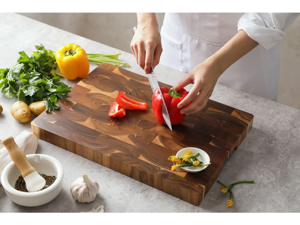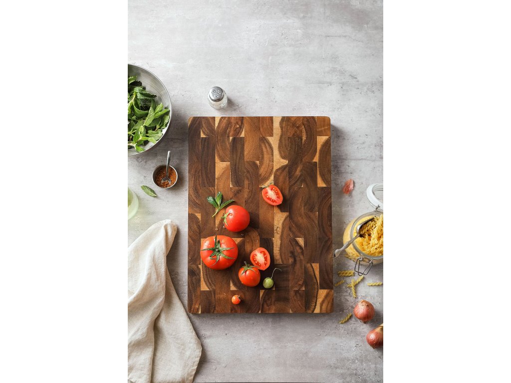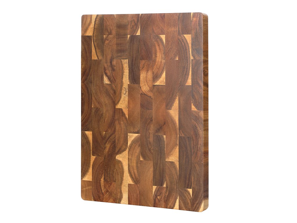 Jedes Schneidebrett wird in einem einzigartigen, mehrstufigen Verfahren poliert, nach dem seine Oberfläche, einschließlich der Kanten, glatt ist. Die natürliche Oberfläche ermöglicht eine einfache Reinigung. Das Brett ist 3,5 cm dick und aus hochwertigem Holz gefertigt, das sehr widerstandsfähig ist. Die spezielle Verbindungstechnik der einzelnen Akazienholzstücke sorgt für eine einzigartige Maserung.
