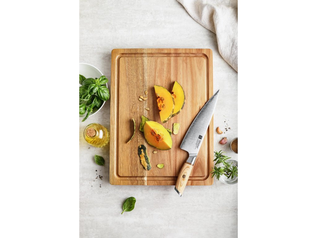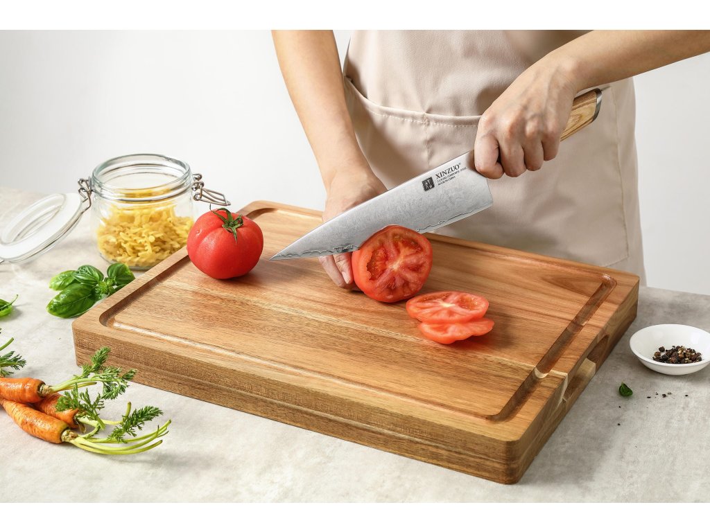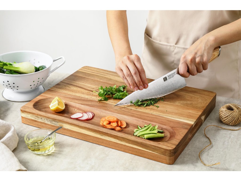 Das hochwertige Schneidebrett aus Akazienholz ist 100% natürlich. Die Oberfläche des Brettes ist mit natürlichem Öl imprägniert und hat bakterientötende Eigenschaften. Sein natürliches Material schont die Klinge der XinZuo-Messer.