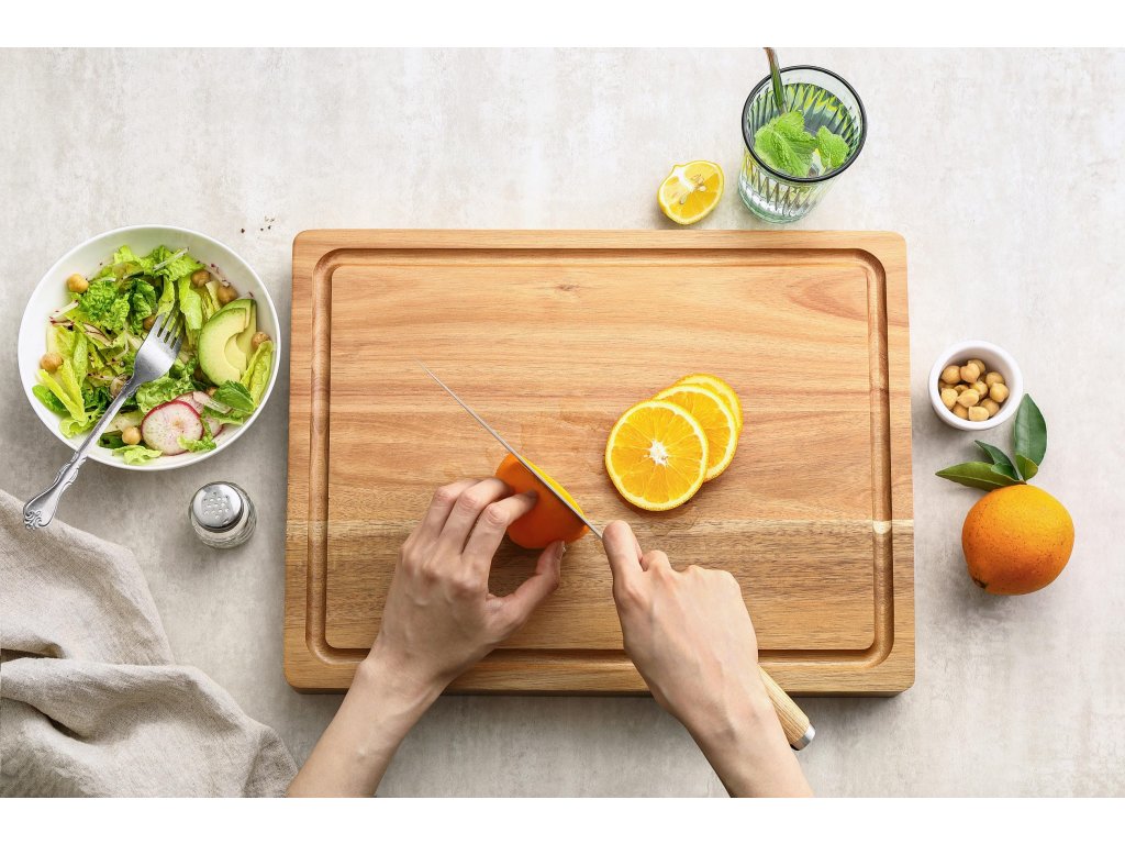 Das Schneidebrett hat ein durchdachtes Design und schont die Messerklinge, so dass sie kaum stumpf wird. Das Schneidebrett hat auf einer Seite eine Saftrille und auf der anderen eine Ablagefläche mit einer Vertiefung. Das macht die Zubereitung von Gemüse, Obst, Fleisch oder Fisch einfacher.