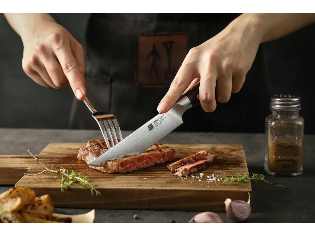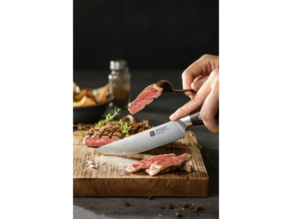 XinZuo Steakmesser - Der perfekte Schnitt für das perfekte Steak. Ein gutes Steak verdient nicht nur die richtige Zubereitung, sondern auch ein hochwertiges Messer, dass es ohne unnötige Risse und Saftverluste aufschneidet. Die Steakmesser von XinZuo sind so konzipiert, dass sie glatte und präzise Schnitte ermöglichen, ohne dass ein großer Kraftaufwand erforderlich ist. Dank der perfekt geschliffenen Klinge lassen sich selbst die saftigsten Steaks mühelos zerteilen, ohne dass sich deren Struktur beschädigt. Wenn Sie auf der Suche nach dem ultimativen Essenserlebnis sind, sollte ein Steakmesser auf keinen Fall in Ihrer Küche fehlen.