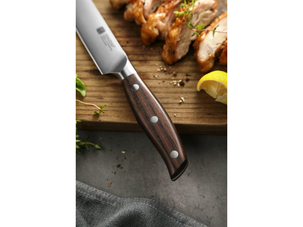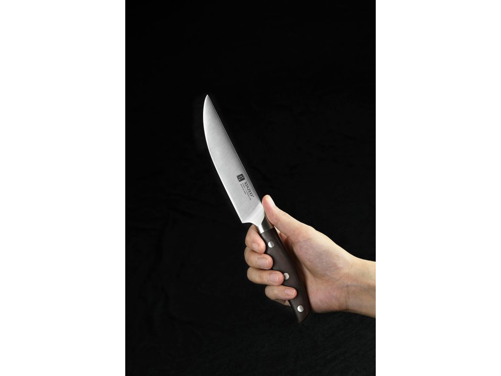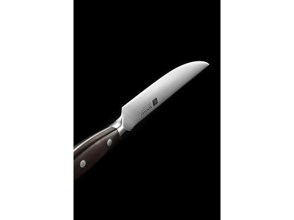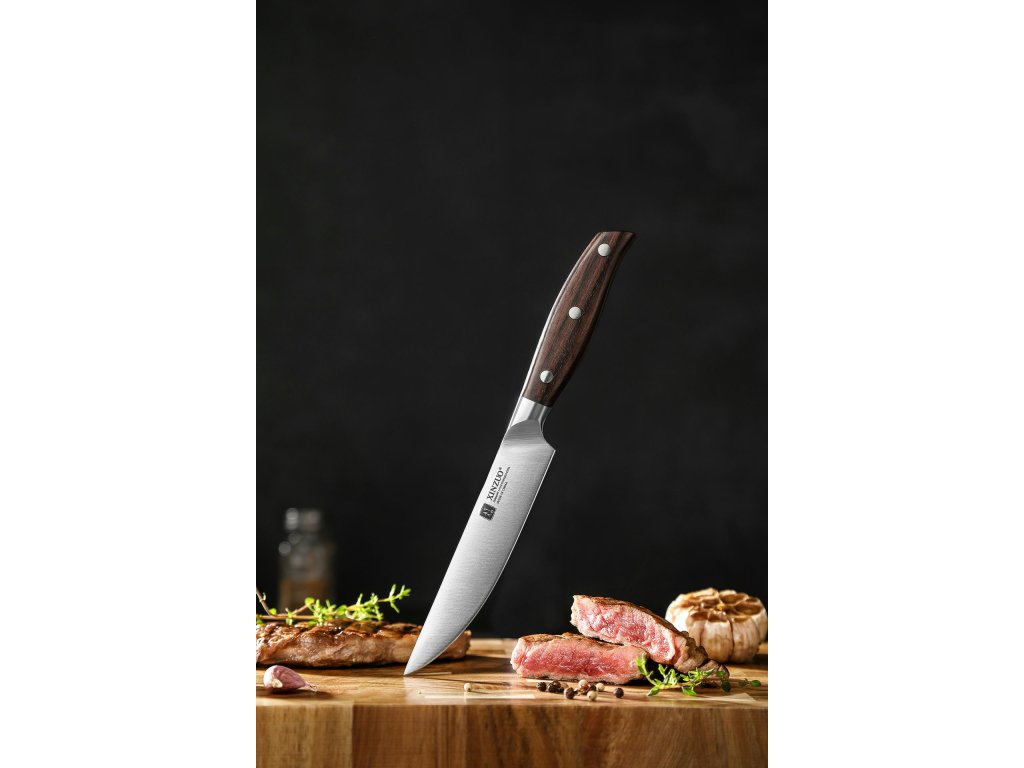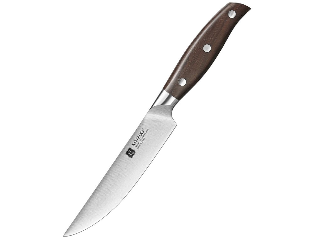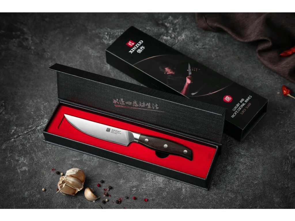 Das XinZuo B35 Zhi, 13 cm ist ein erschwingliches Steakmesser aus hochwertigem deutschem Stahl mit Griff aus Sandelholz.