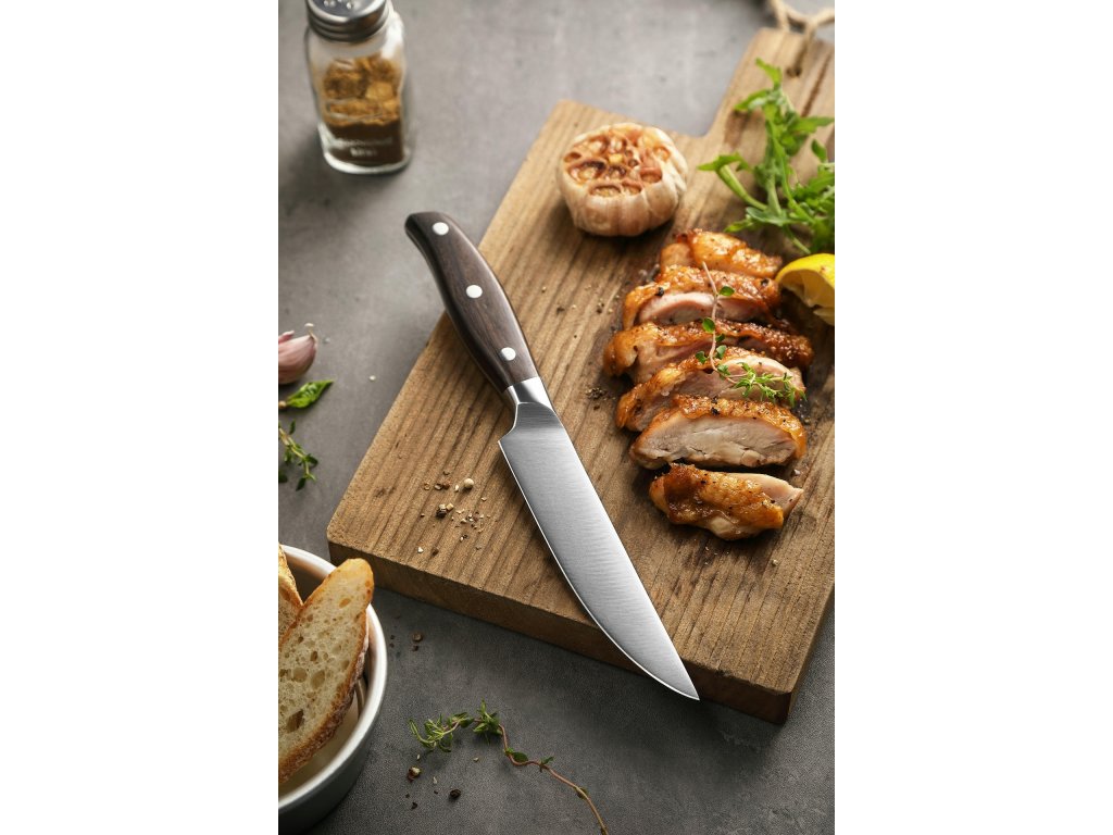 Dieses Steakmesser ist aus hochwertigem deutschem Stahl gefertigt, der für die Herstellung von hochwertigen Messern verwendet wird. Seine Klinge ist eben aus diesem Stahl mit einer Härte von 56-58 Rockwell gefertigt. Hochwertiger Stahl in einer Kombination von traditioneller Herstellung garantiert eine lange Lebensdauer des Messers. Die Oberfläche des Messers bietet beim Schneiden Komfort, ohne dass es reibt oder dass die Zutaten an die Klinge pappen. Der Messergriff ist aus hochwertigem Sandelholz gefertigt, das mit der Zeit weder weicher wird noch einen Geruch annimmt. Dank seiner perfekten Form und Länge wird das Schneiden zum Vergnügen und außerdem liegt das Messer gut in der Hand. Aufgrund des natürlichen Griff-Designs kann die Farbe und das Design leicht von den Produktbildern abweichen, da der Griff aus einem anderen Holzstück gefertigt wurde oder da das Alter des Holzes unterschiedlich ist.
