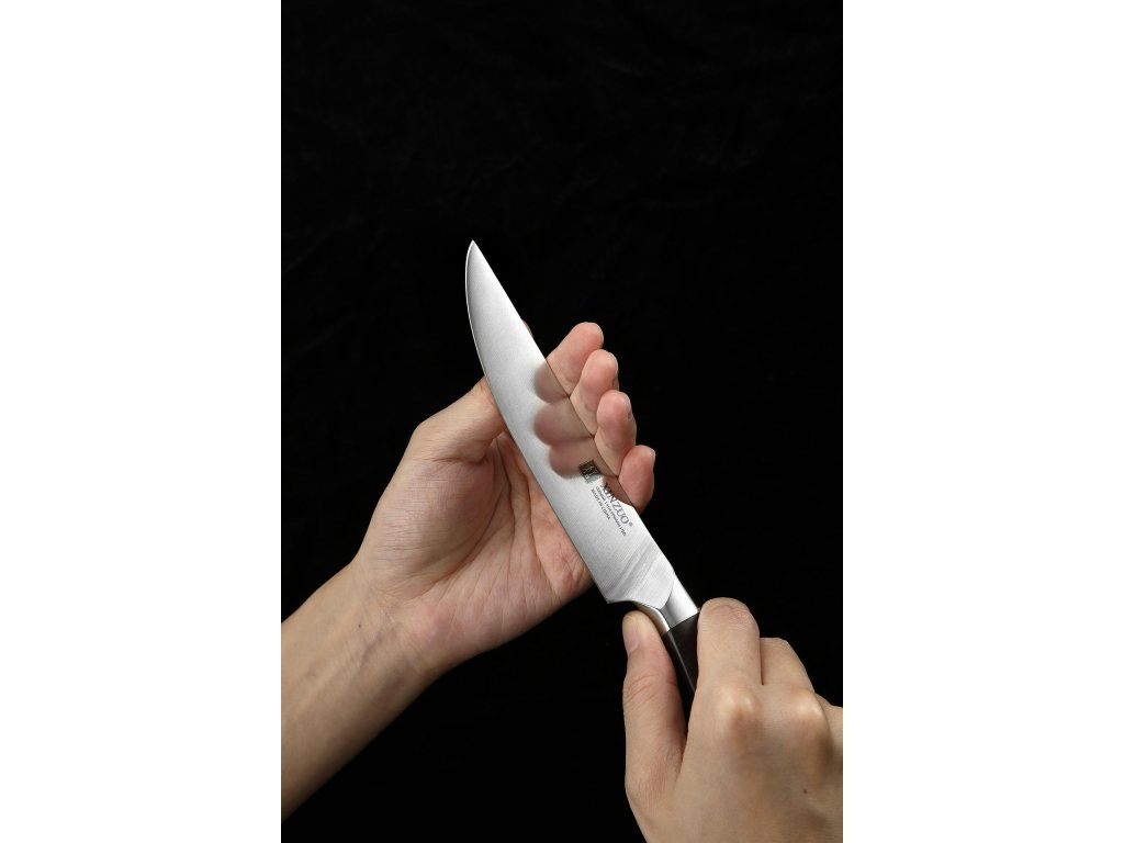 Merkwürdigkeit: Als ein führender Innovator in der Herstellung von Küchenmessern kombiniert XinZuo traditionelle und modernste Fertigungstechniken. Dank der hochmodernen Vakuum-Wärmebehandlungsmethode haben XinZuo Küchenmesser eine höhere Härte und Schärfe sowie eine längere Lebensdauer als Messer, die nur durch herkömmliche Wärmebehandlung hergestellt werden. Gepaart mit dem traditionellen letzten Schleifen der Messer von Hand durch Messermachermeister, deren über Generationen weitergegebenes Können von keiner Maschine übertroffen wird, haben XinZuo Küchenmesser eine erstklassige Schärfe, die maschinell geschliffene Messer nie erreichen können.