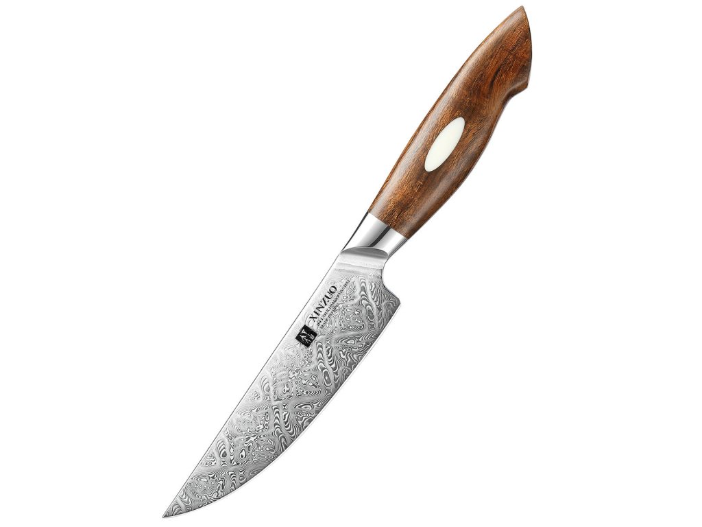 Handgefertigtes Damast-Steakmesser XinZuo aus der Serie B46D mit einzigartiger Klinge aus zwei verschiedenen Damaststählen und Hartholzgriff in einer Geschenkbox.