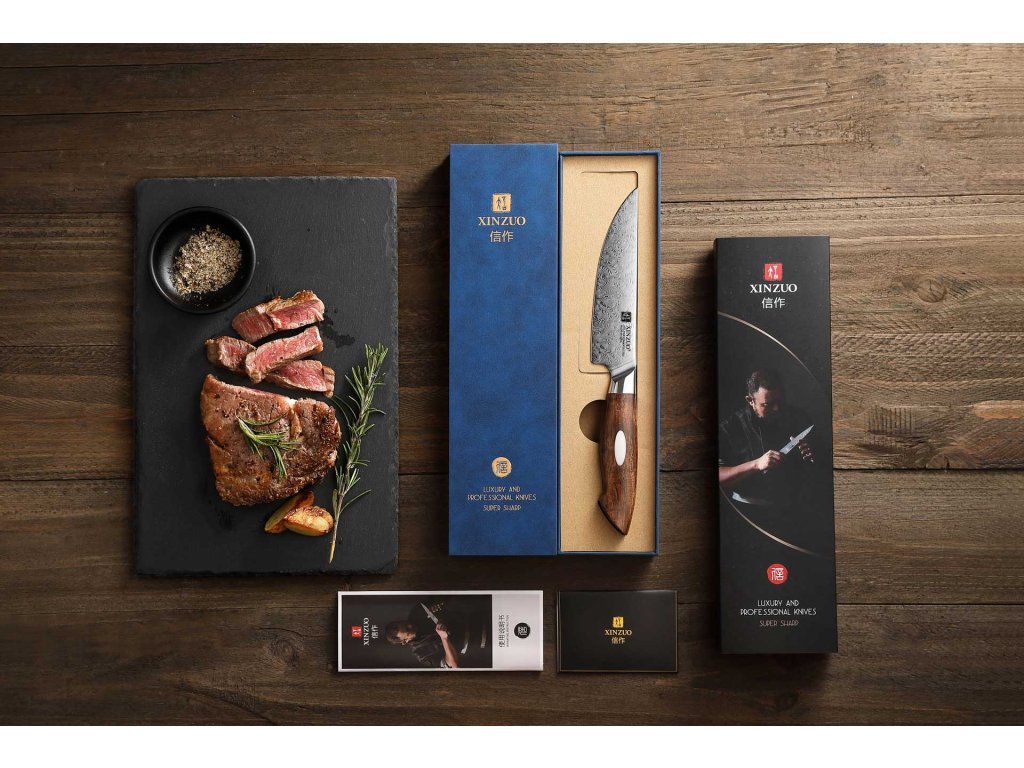 Das Steakmesser XinZuo Jiang B46D ist in einer luxuriösen Geschenkbox verpackt und eignet sich somit als ein ideales praktisches Geschenk. Das luxuriöse Design der Geschenkbox und das hochwertige XinZuo Messer im Set wird jeden Beschenkten Freude machen.