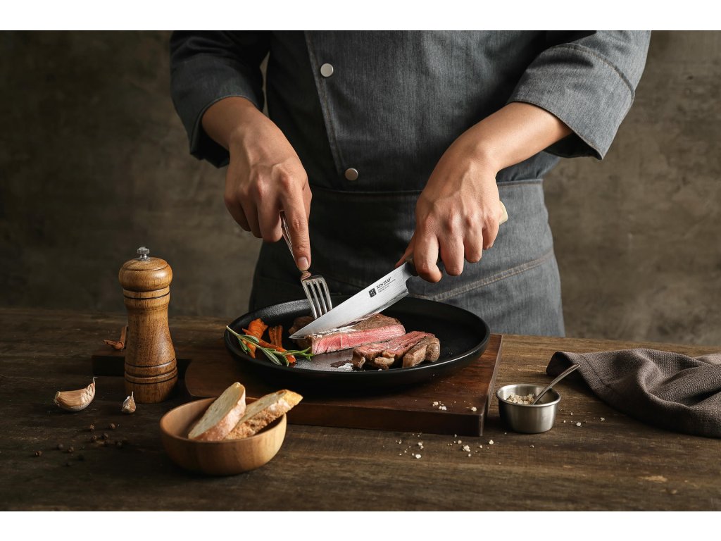 XinZuo Steakmesser - Der perfekte Schnitt für das perfekte Steak. Ein gutes Steak verdient nicht nur die richtige Zubereitung, sondern auch ein hochwertiges Messer, dass es ohne unnötige Risse und Saftverluste aufschneidet. Die Steakmesser von XinZuo sind so konzipiert, dass sie glatte und präzise Schnitte ermöglichen, ohne dass ein großer Kraftaufwand erforderlich ist. Dank der perfekt geschliffenen Klinge lassen sich selbst die saftigsten Steaks mühelos zerteilen, ohne dass sich deren Struktur beschädigt. Wenn Sie auf der Suche nach dem ultimativen Essenserlebnis sind, sollte ein Steakmesser auf keinen Fall in Ihrer Küche fehlen.