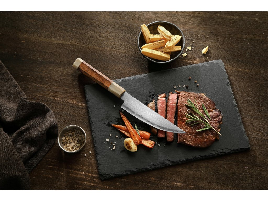 Der im traditionellen achteckigen japanischen Stil gefertigte Griff wurde mit höchster Sorgfalt auf Ergonomie und angenehmen Halt auch bei langem Gebrauch entwickelt. Perfekte Balance und präzise gestaltete Kanten verhindern ein Abrutschen – selbst bei nassen Händen. Durch diese Konstruktion eignet sich das Messer gleichermaßen für Rechts- wie auch für Linkshänder.