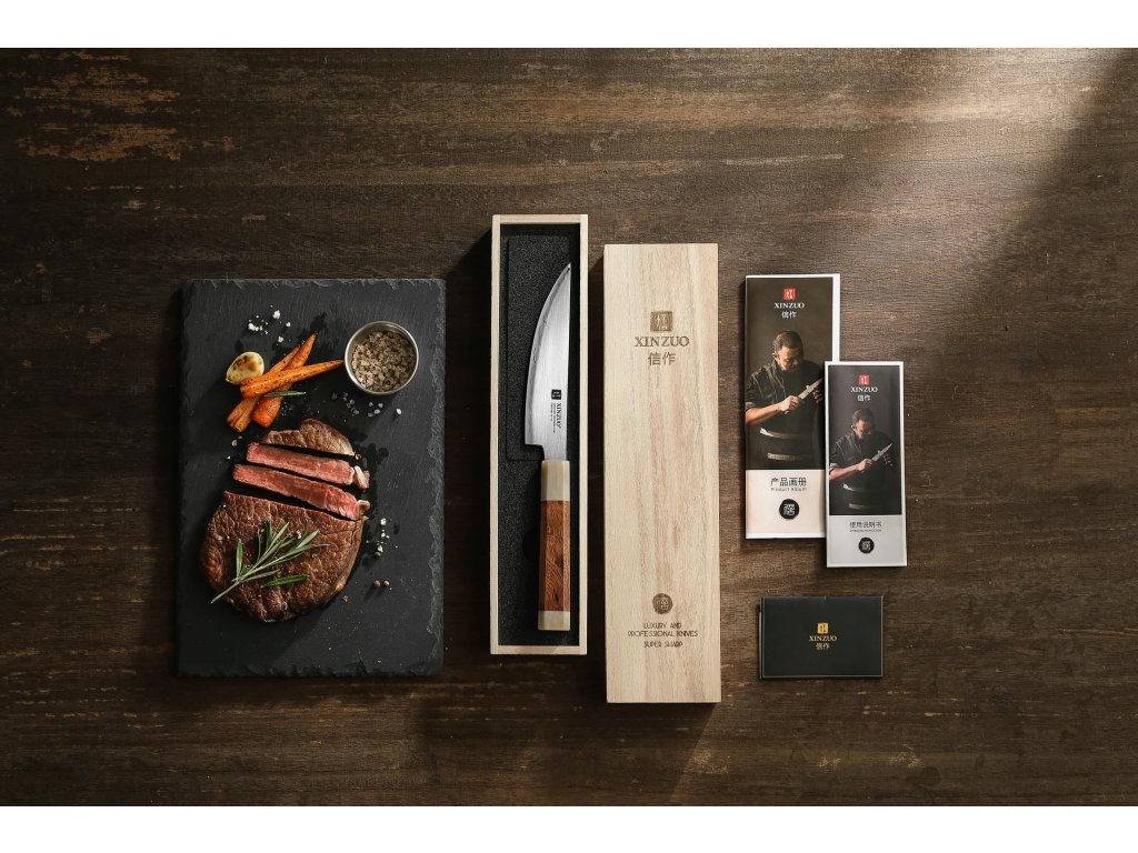 Das luxuriose Steakmesser XinZuo Zhen X05Z 14 cm mit einer Klinge aus japanischem Stahl und einem traditionellen achteckigen Griff, wird in einer eleganten Holzbox geliefert.