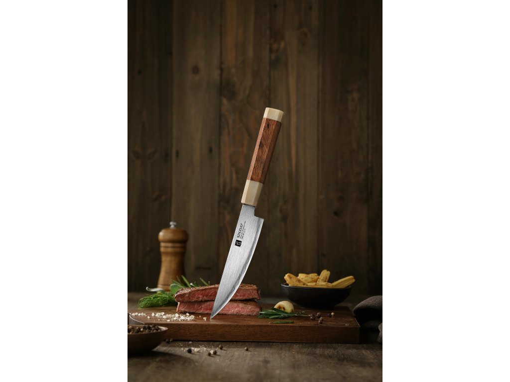Das Steakmesser XinZuo Zhen X05Z stammt aus der traditionellen chinesischen Messerstadt Yangjiang, wo seit Jahrhunderten die feinsten Messer hergestellt werden. Die lokalen Messerschmiede haben ihre Fertigkeiten in der Messerherstellung und -bearbeitung von Generation zu Generation weitergegeben. XinZuo nutzt das Beste aus der modernen und traditionellen Messerherstellung, um dieses Messer herzustellen. Jedes Messer von XinZuo ist dank der abschließenden manuellen Präzisionsbearbeitung ein Unikat.