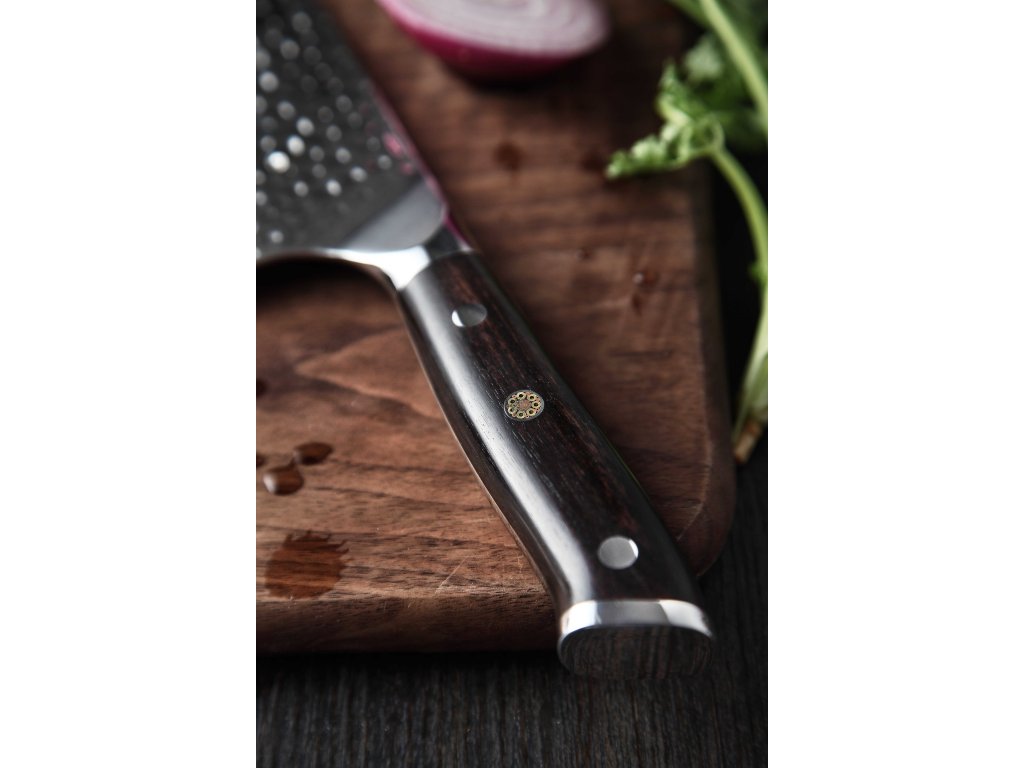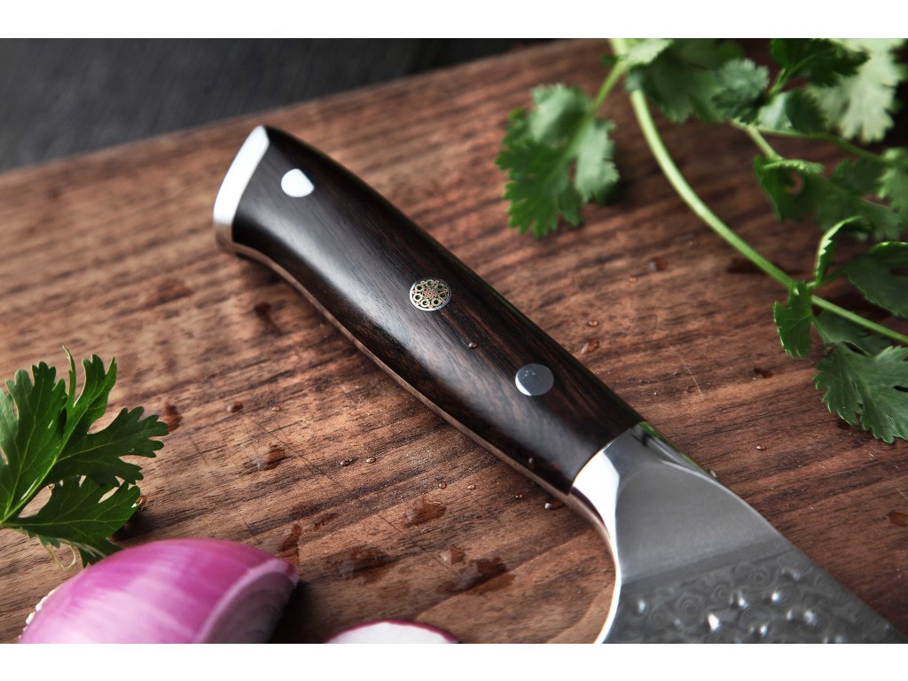 Dieses TAO Messer ist aus hochwertigem Damaszener Stahl gefertigt, der für die Herstellung der besten Messer verwendet wird. Die Messerklinge mit einer Härte von 60±2 Rockwell besteht aus 67 Lagen. Hochwertiger Stahl in einer Kombination von traditioneller Herstellung garantiert eine lange Lebensdauer des Messers. Die Oberfläche des Messers bietet beim Schneiden Komfort, ohne dass es reibt oder dass die Zutaten an die Klinge pappen. Der Griff des Messers ist aus Ebenholz gefertigt, das mit der Zeit weder weicher wird noch einen Geruch annimmt. Dank seiner perfekten Form und Länge wird das Schneiden zum Vergnügen und außerdem liegt das Messer gut in der Hand. Aufgrund des natürlichen Griff-Designs kann die Farbe und das Design leicht von den Produktbildern abweichen, da der Griff aus einem anderen Holzstück gefertigt wurde oder da das Alter des Holzes unterschiedlich ist. Der Farbton des Musters auf der Klinge kann unterschiedlich sein, da jedes Messer durch das Stahlschichten einzigartig ist.
