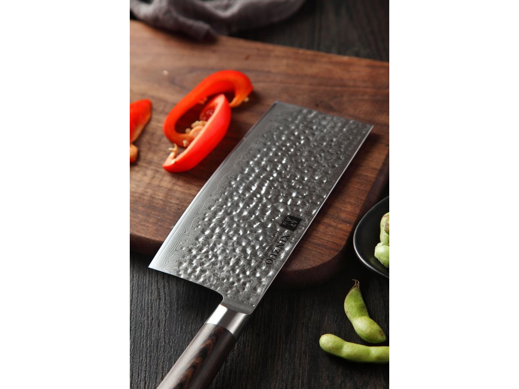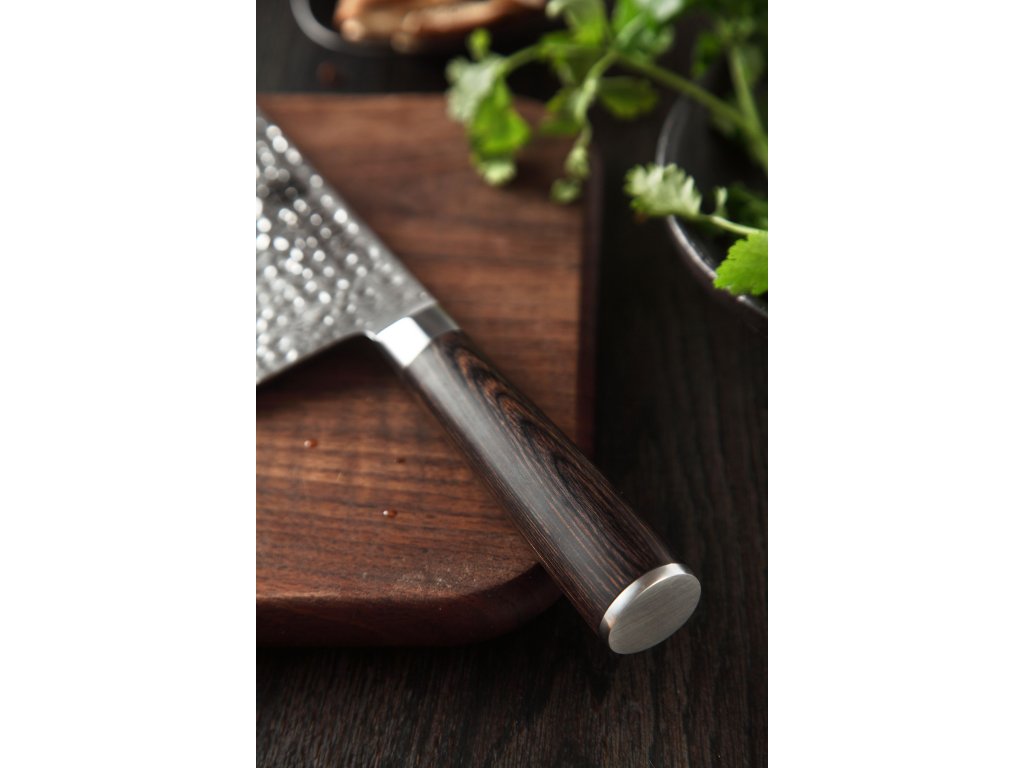 Dieses TAO Messer ist aus hochwertigem Damaszener Stahl gefertigt, der für die Herstellung der besten Messer verwendet wird. Die Messerklinge mit einer Härte von 60±2 Rockwell besteht aus 67 Lagen. Hochwertiger Stahl in einer Kombination von traditioneller Herstellung garantiert eine lange Lebensdauer des Messers. Die Oberfläche des Messers bietet beim Schneiden Komfort, ohne dass es reibt oder dass die Zutaten an die Klinge pappen. Der Messergriff besteht aus Pakkaholz, das mit der Zeit weder weicher wird noch Geruch annimmt. Dank seiner perfekten Form und Länge wird das Schneiden zum Vergnügen und außerdem liegt das Messer gut in der Hand. Aufgrund des natürlichen Griff-Designs kann die Farbe und das Design leicht von den Produktbildern abweichen, da der Griff aus einem anderen Holzstück gefertigt wurde oder da das Alter des Holzes unterschiedlich ist. Der Farbton des Musters auf der Klinge kann unterschiedlich sein, da jedes Messer durch das Stahlschichten einzigartig ist.