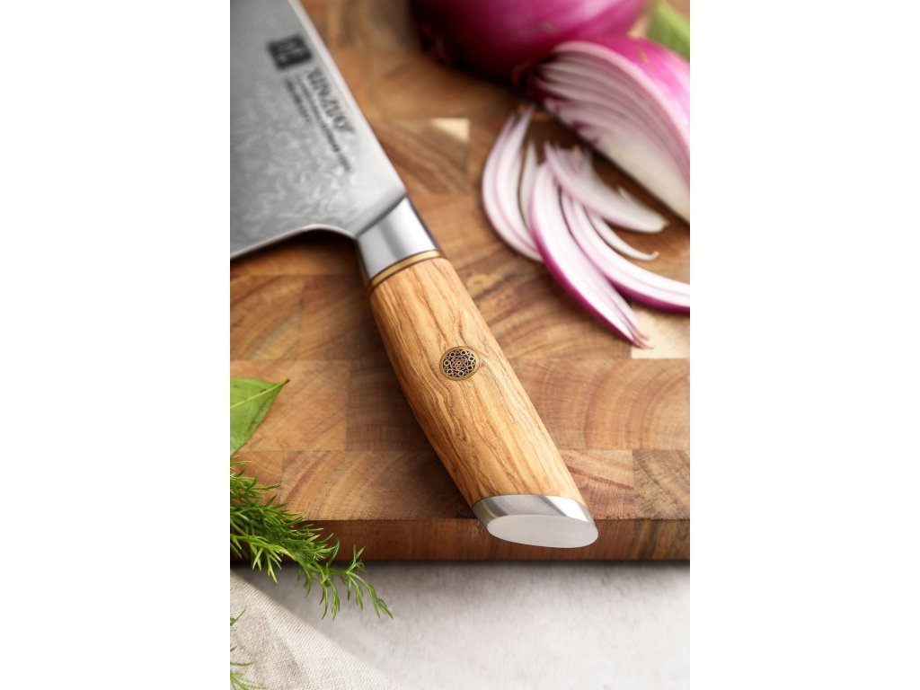 Der Griff des Messers ist aus hochwertigem Olivenholz gefertigt. Das Olivenholz ist eben wegen seiner Festigkeit und der interessanten Farb- und Maserungsvielfalt ideal für den Griff. Aufgrund des natürlichen Griff-Designs kann die Farbe und das Design leicht von den Produktbildern abweichen, da der Griff aus einem anderen Holzstück gefertigt wurde oder da das Alter des Olivenholzes unterschiedlich ist.