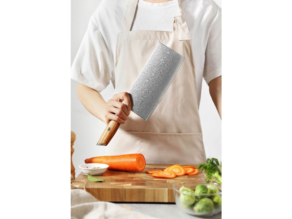 Das chinesische Allzweckmesser TAO XinZuo Lan B37 19 cm ist ein Design-Stück mit einer Damastklinge und Griff aus Olivenholz.