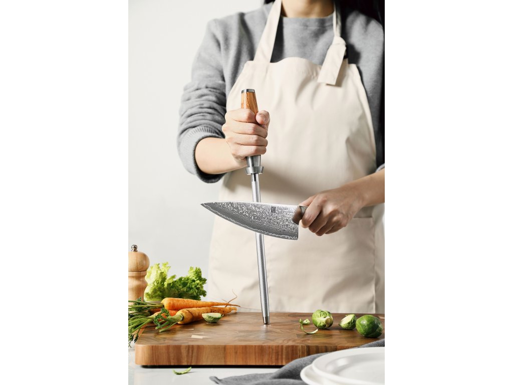Der Premium diamtantbeschichtete Wetzstahl aus der Lan B37-Serie von XinZuo zum einfachen und schnellen Schärfen von XinZuo-Messern. Das Schärfen hochwertiger Messer aus deutschem oder Damaszener Stahl wird zum Vergnügen. Der Wetzstahl hat ein elegantes Design, das in die meisten Küchen passt. Der ergonomische Griff aus Olivenholz passt beim Messerschärfen gut in die Hand und sieht auch edel aus.