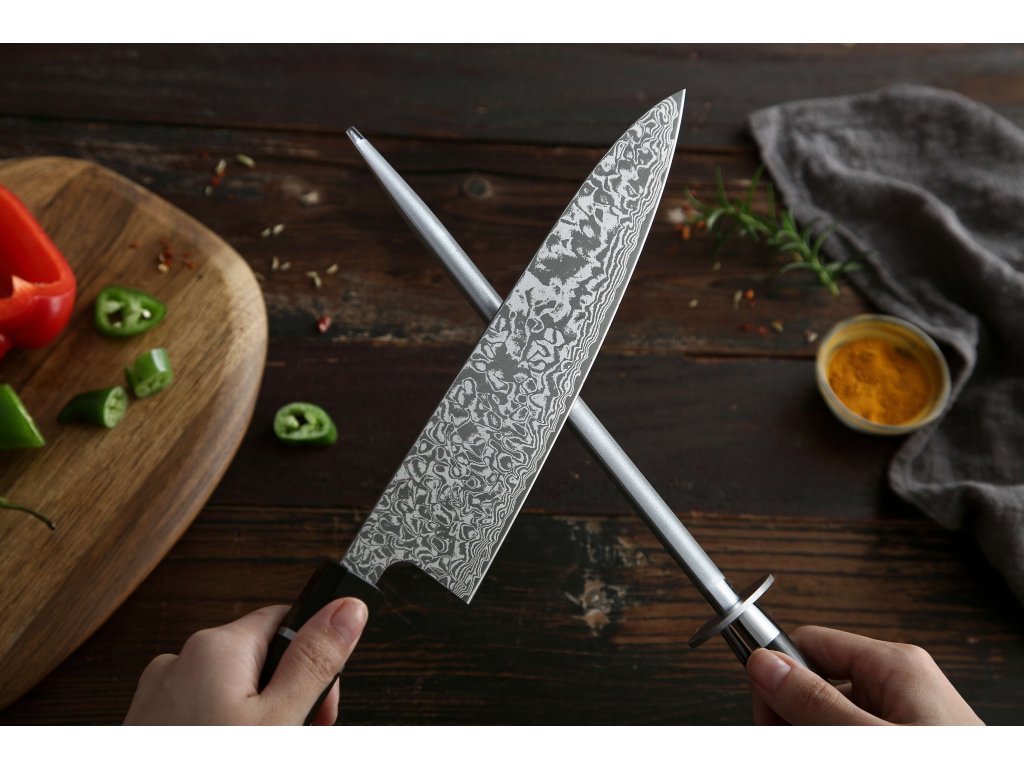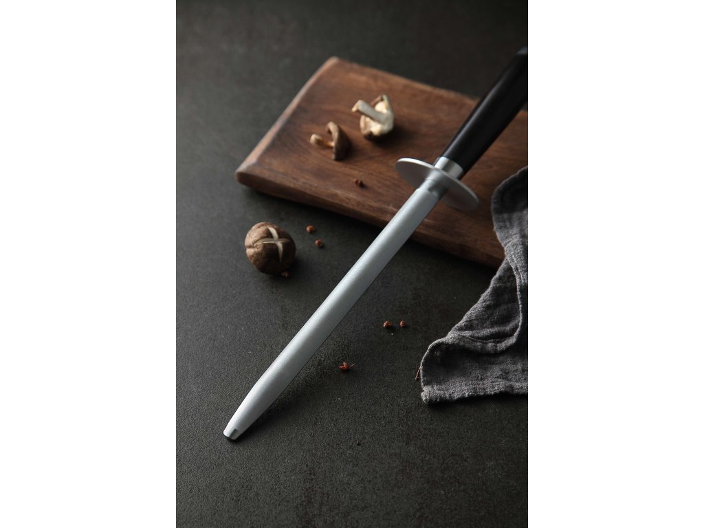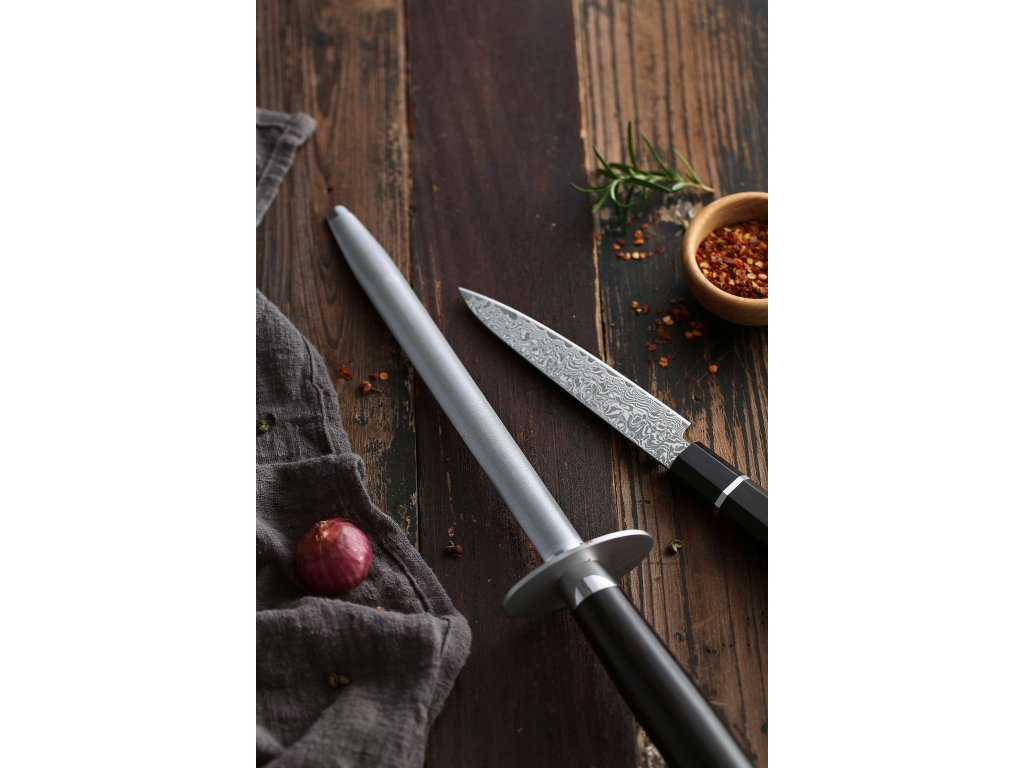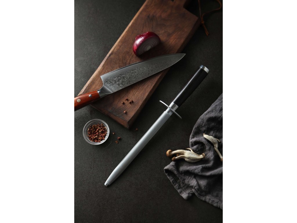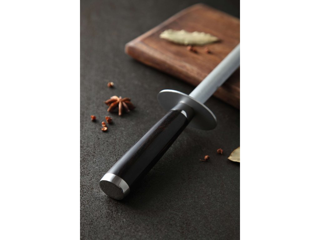 Der XinZuo-Premium-Wetzstahl mit einer Diamantbeschichtung für einfaches und schnelles Messerschärfen. Dank ihm wird das Schärfen hochwertiger Messer aus deutschem oder Damaszener Stahl zum Vergnügen. Der Wetzstahl hat ein elegantes Design, das in die meisten Küchen passt. Dank seinem ergonomischen Griff aus Ebenholz passt er bequem in die Hand.