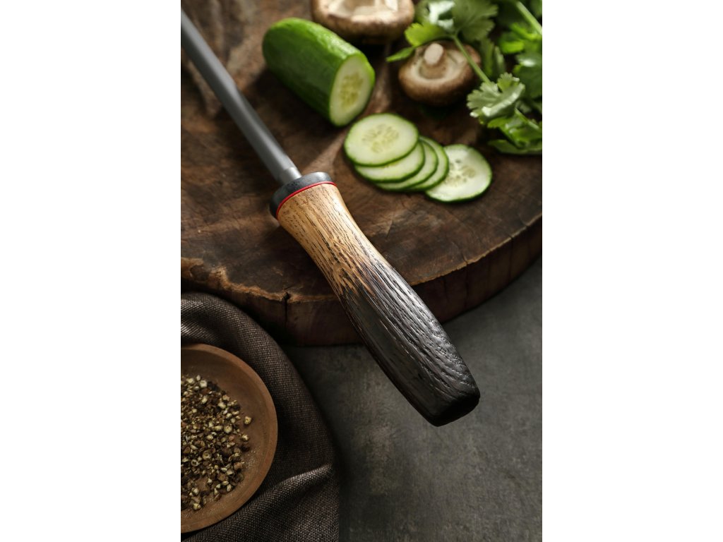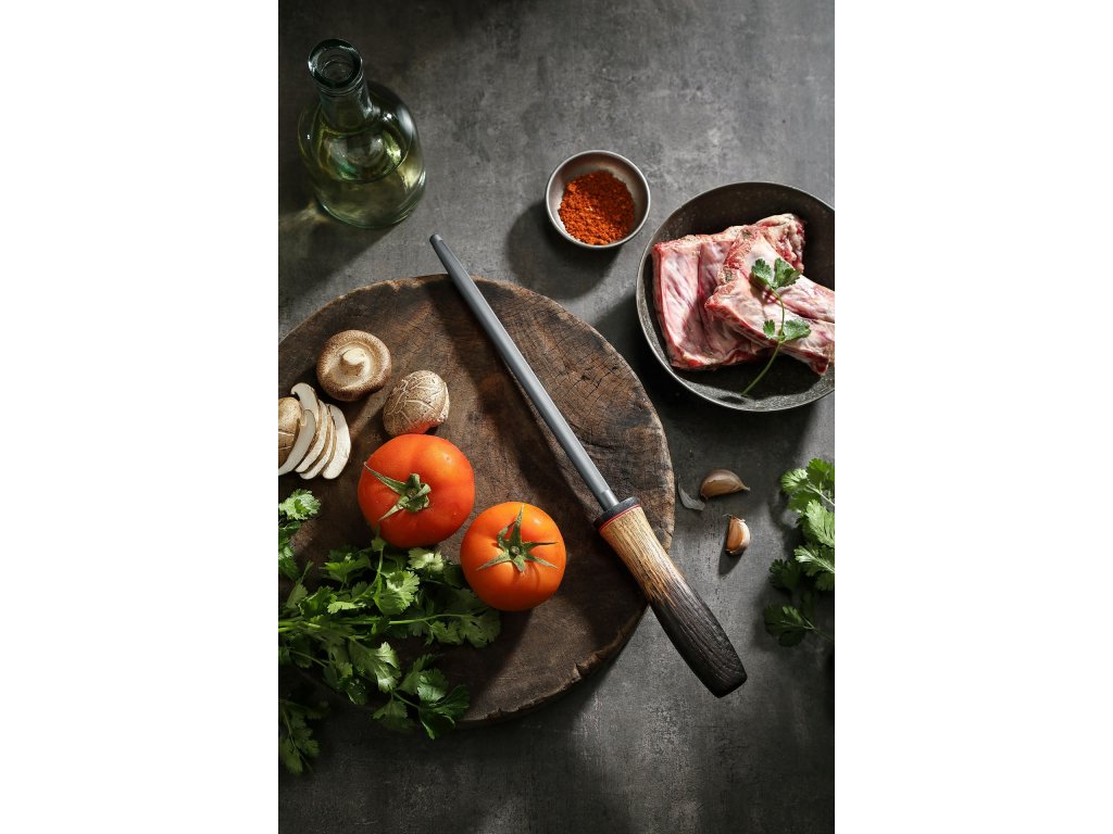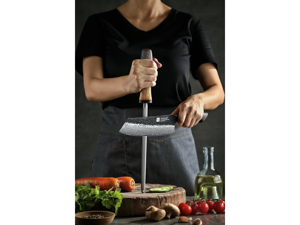 Der XinZuo-Premium-Wetzstahl hohem Kohlenstoffgehalt für ein einfaches und schnelles Messerschärfen. Dank ihm wird das Schärfen hochwertiger Messer aus deutschem oder Damaszener Stahl zum Vergnügen. Der Wetzstahl hat ein elegantes Design, das in die meisten Küchen passt. Dank seinem ergonomischen Griff aus Weiß-Eiche passt er bequem in die Hand.